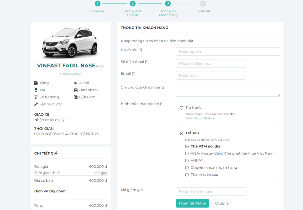 Đọc kỹ các thông tin về xe, thủ tục thuê xe. Ở bước này bạn vẫn có thể thay đổi thời gian nhận/trả xe, nhập mã khuyến mãi (nếu có).
